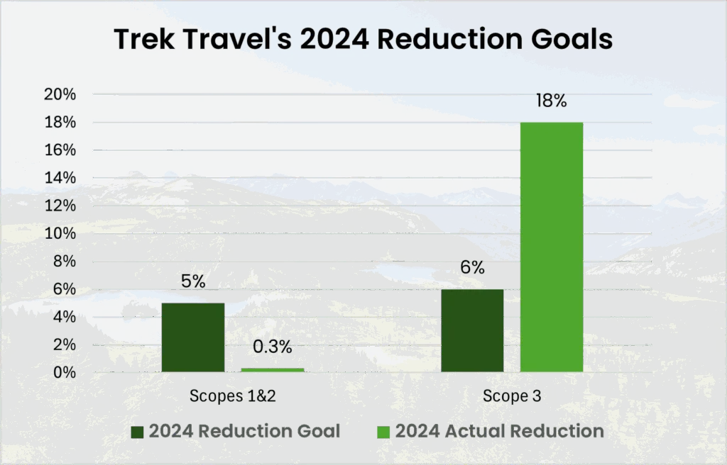 Our overall per guest per day emissions decreased in 2024 and even more impressively, so did our total emissions (excluding guest travel) despite hosting significantly more guests than the preceding year. That’s a milestone we’re proud of. We missed our absolute Scope 1 & 2 reduction goal however, due to a small increase in vehicle emissions due to running more trips. We await progress in the electric passenger van market as well as electric vehicle charging infrastructure in order to directly address these emissions. We’re encouraged by our overall progress but know Net Zero is a journey and we are just getting started. We’ll continue to work to reduce our footprint each year. Some years we’ll hit our targets, some we may not, but we’re committed to transparency every step of the way so we can share what we learn as we work toward lower carbon travel.