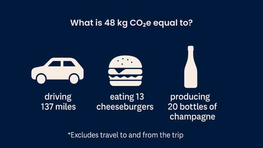 Carbon footprints can be hard to visualize. Using our 2023 results of 48 kg CO₂e per guest per day (excluding travel to and from the trip) we offer a few comparisons below. Whilst our score is lower than other vacations (Maldives trips average 97 kg CO₂e/customer/day and ocean cruises 297 kg CO₂e/customer/day) our emissions still matter and must be reduced.