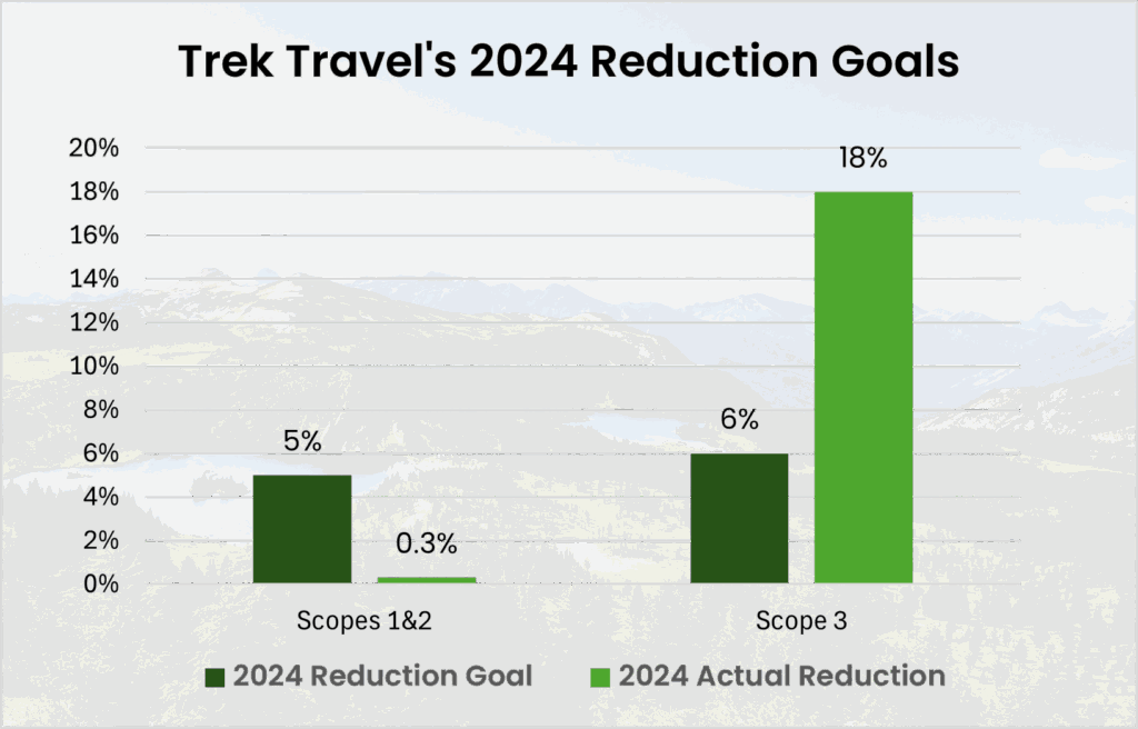 Our overall per guest per day emissions decreased in 2024 and even more impressively, so did our total emissions (excluding guest travel) despite hosting significantly more guests than the preceding year. That’s a milestone we’re proud of. We missed our absolute Scope 1 & 2 reduction goal however, due to a small increase in vehicle emissions due to running more trips. We await progress in the electric passenger van market as well as electric vehicle charging infrastructure in order to directly address these emissions. We’re encouraged by our overall progress but know Net Zero is a journey and we are just getting started. We’ll continue to work to reduce our footprint each year. Some years we’ll hit our targets, some we may not, but we’re committed to transparency every step of the way so we can share what we learn as we work toward lower carbon travel.